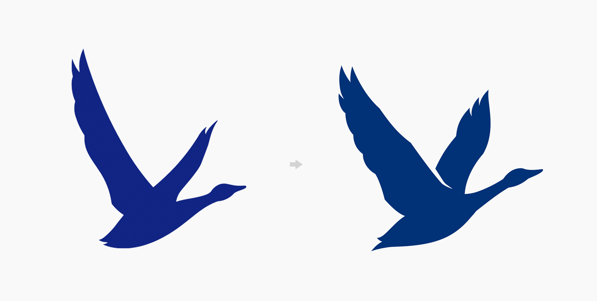 除了大雁數(shù)量增加外,每個(gè)大雁的剪影輪廓也進(jìn)行了更細(xì)致和生動(dòng)的刻畫。就拿新舊LOGO中的兩只深藍(lán)色大雁來說,新的大雁翅膀上的羽毛更豐富,脖子伸長(zhǎng)了,尾巴翹的也更自然。