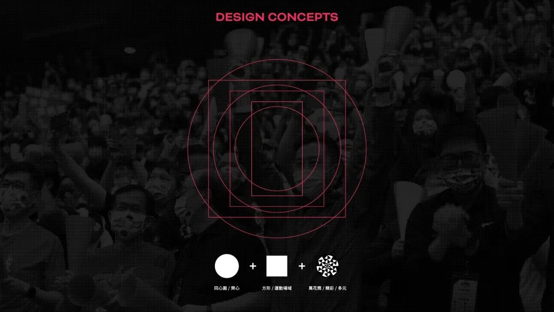 家的齊心——同心圓/方形結(jié)構(gòu)的運(yùn)動場——四方型以及代表回憶與精采賽事——萬花筒結(jié)構(gòu),發(fā)展出新視覺系統(tǒng)與LOGO。